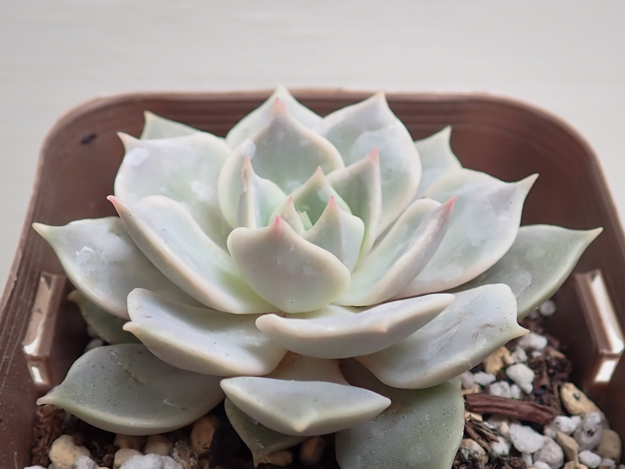 チョークのような青白いロゼットが美しい、リラシナ(E. lilacina)x静夜(E. derenbergii)のハイブリッド。