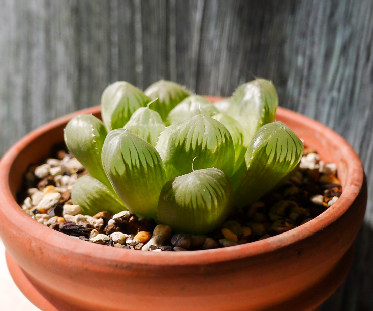 ハオルチア オブツーサ 王蟲 ハオルチア 2014年03月30日 ユリ科ハオルチア属 オブツーサ 王蟲 学名:Haworthia obtusa 詳細不明 生育:夏型 越冬5℃ 増やし方:カット芽挿し、葉挿し、子吹き ブラックベルディアナを戴いたのと同時期に入手したオブツーサ。 冬の間、ちょっと水控えめにしていたらすねて窓が曇ってしまった。 根っこが結構張っているからと、大きさの丁度良い素焼き鉢に替えたのも悪かったかも。 せっかくぷりっと大きな窓があるので、もうちょっと湿度が保てる環境を作ってやりたい。