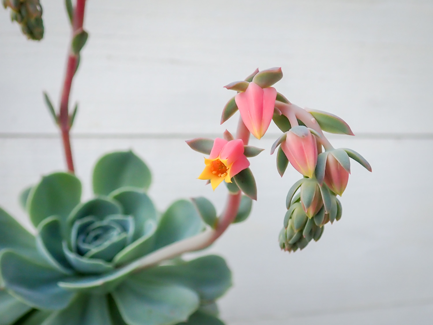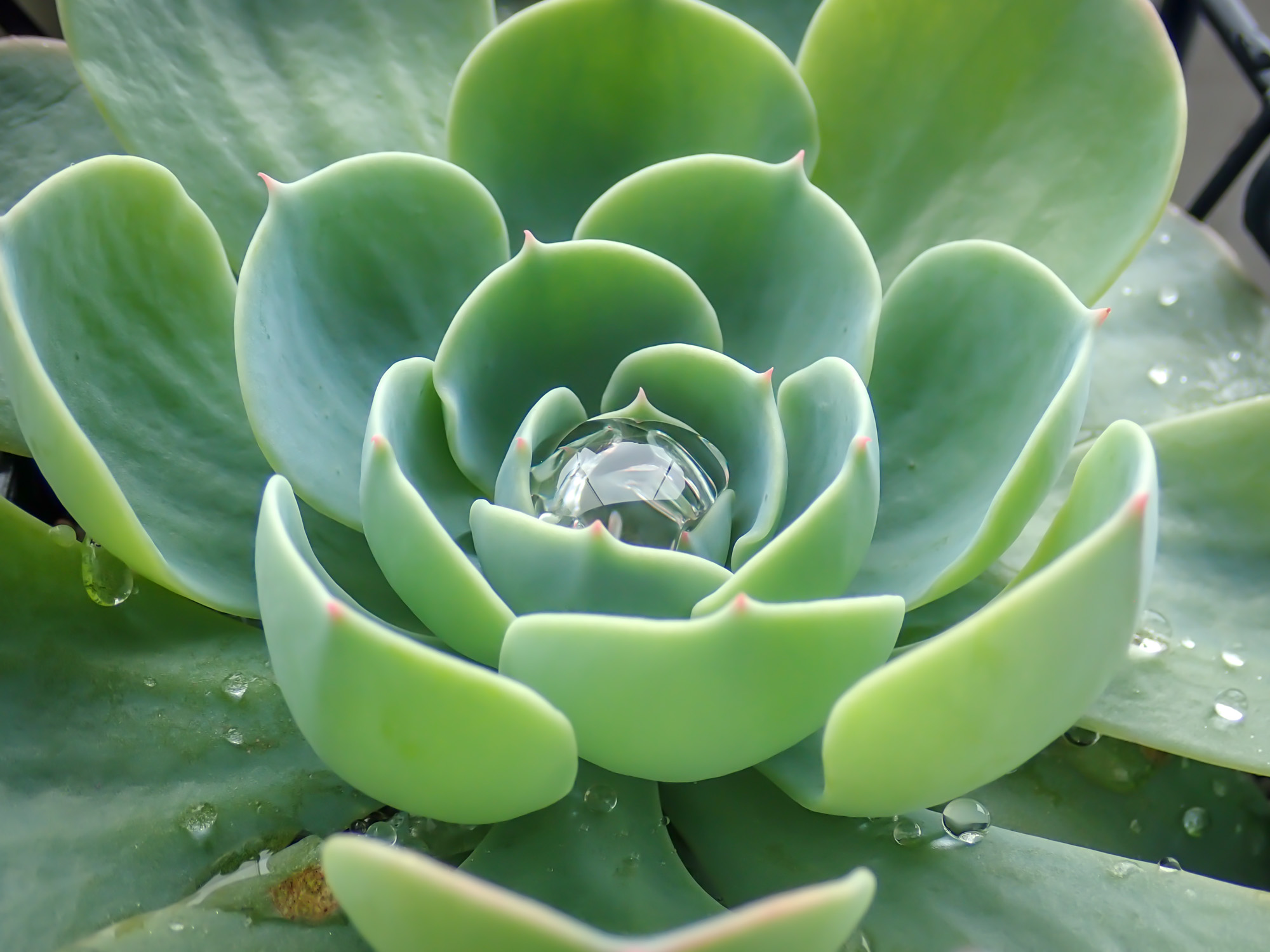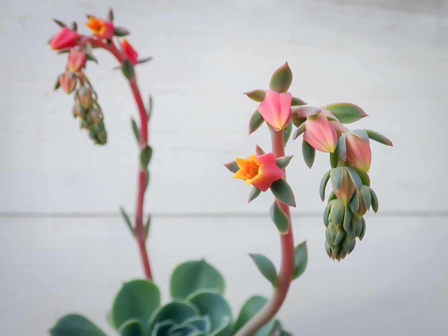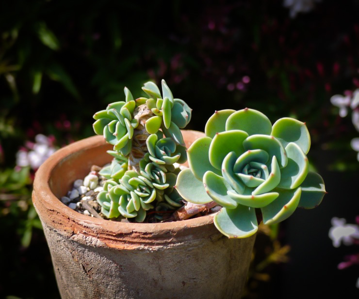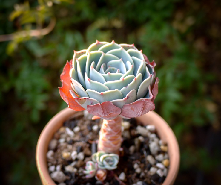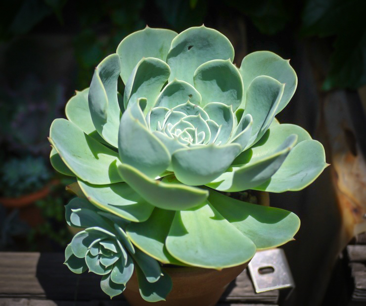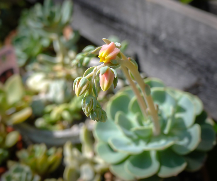 「七福神」と呼ばれるエケベリアには、原種であるセクンダ(E.secunda)と、ギビフローラ メタリカ(E. gibbiflora 'Metallica')との交配種であるインブリカータ(E. 'Imbricata')の2種があるけど見分けつかない。インブリカータの方が若干子吹きしにくいらしい。