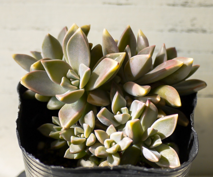 グラプトペタルム パラグアイエンシス -朧月 グラプトペタルム 2016年05月27日 ベンケイソウ科グラプトペタルム属 パラグアイエンシス(朧月/初霜/淡雪) 学名:Graptopetalum paraguayensis 育成:春秋型 越冬0℃ 茎立ちタイプ 増やし方:カット芽挿し、葉挿し、子吹き 越冬には目安として3℃は欲しいが、零下でも割と生き抜く剛健種。 吹きさらしの戸外で、炎天下の陽炎の中でも氷点下の雪の下でもめげずにうじゃうじゃ群生していたりする。 茎立ちして倒れたあとは這うように延びていくが、そんな暴れっぷりにも味がある。 いつかこいつでグリーンカーテンを作りたい。