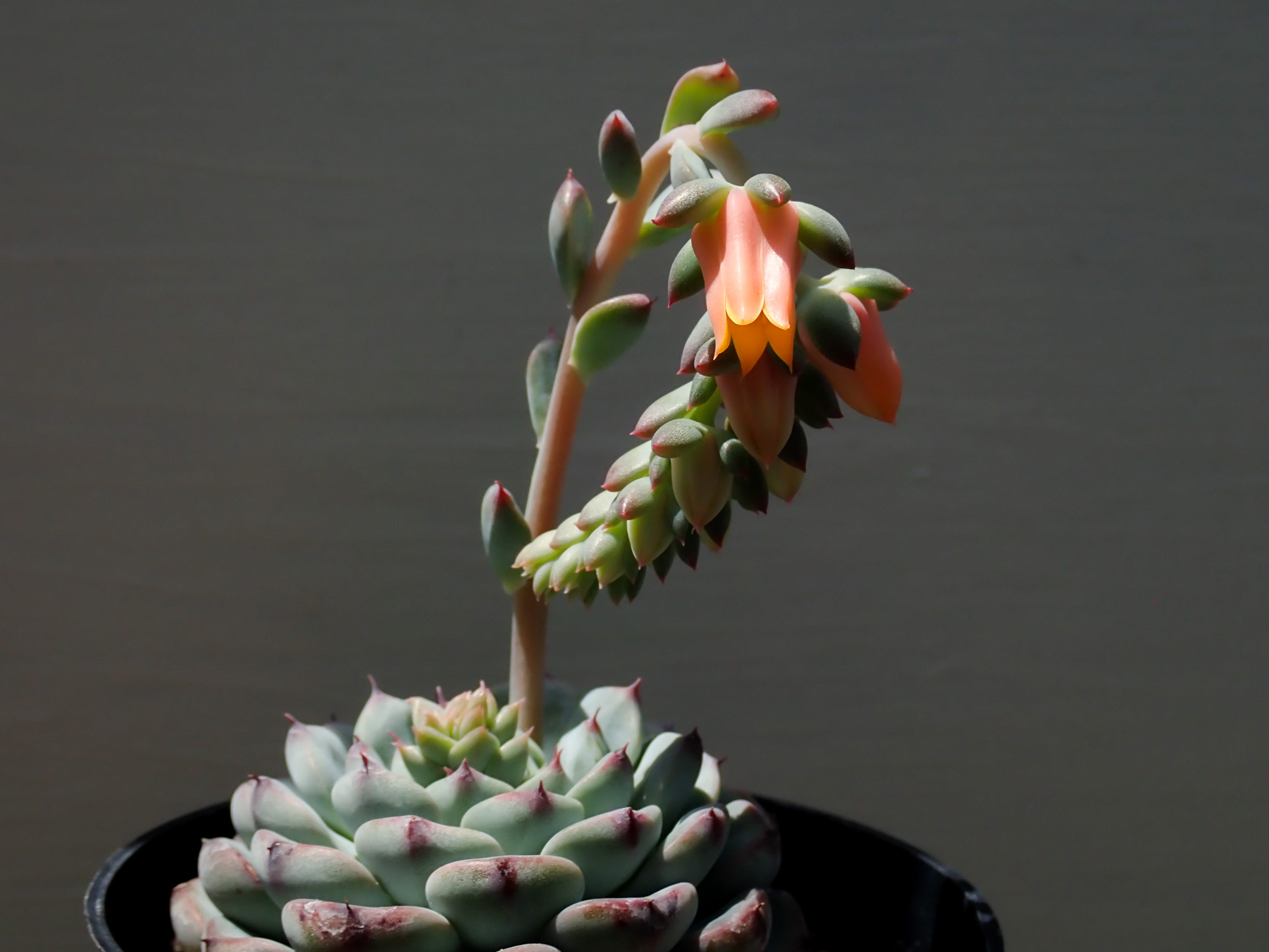 エケベリア ミニマハイブリッド エケベリア 2022年05月21日 ベンケイソウ科エケべリア属 ミニマハイブリッド 学名:Echeveria 'Minima Hybrid' 育成:春秋型 越冬-1℃ 増やし方:カット芽挿し、葉挿し、子吹き ミニマのハイブリッドはたくさんあるが、これは単に「ミニマハイブリッド」として流通しており詳細は不明。 純粋なミニマより葉のサイズも全体サイズも大きめ。 花穂がめちゃくちゃかわいい。 追記:2022/06/02 開花。